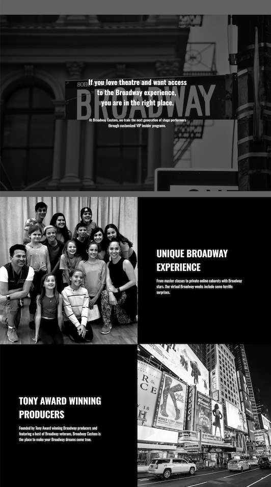 Broadway Custom provides personalized training for teens and preteens led by seasoned Broadway professionals in New York City. The program focuses on strengthening all areas of musical theatre performance, offering students insider access and guidance from artists with extensive Broadway experience.