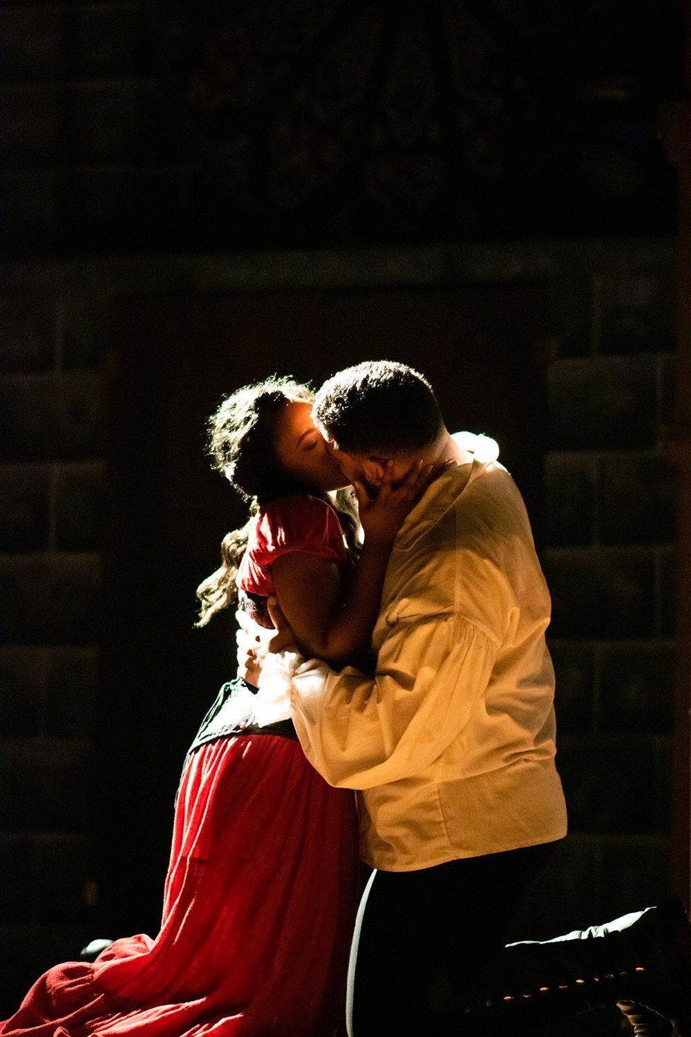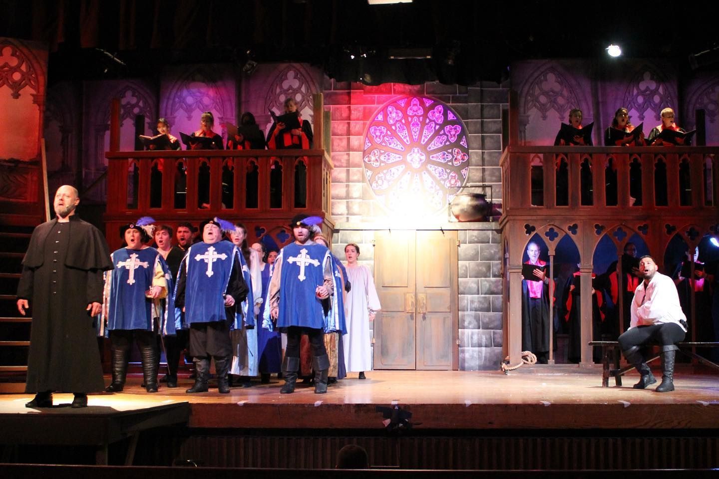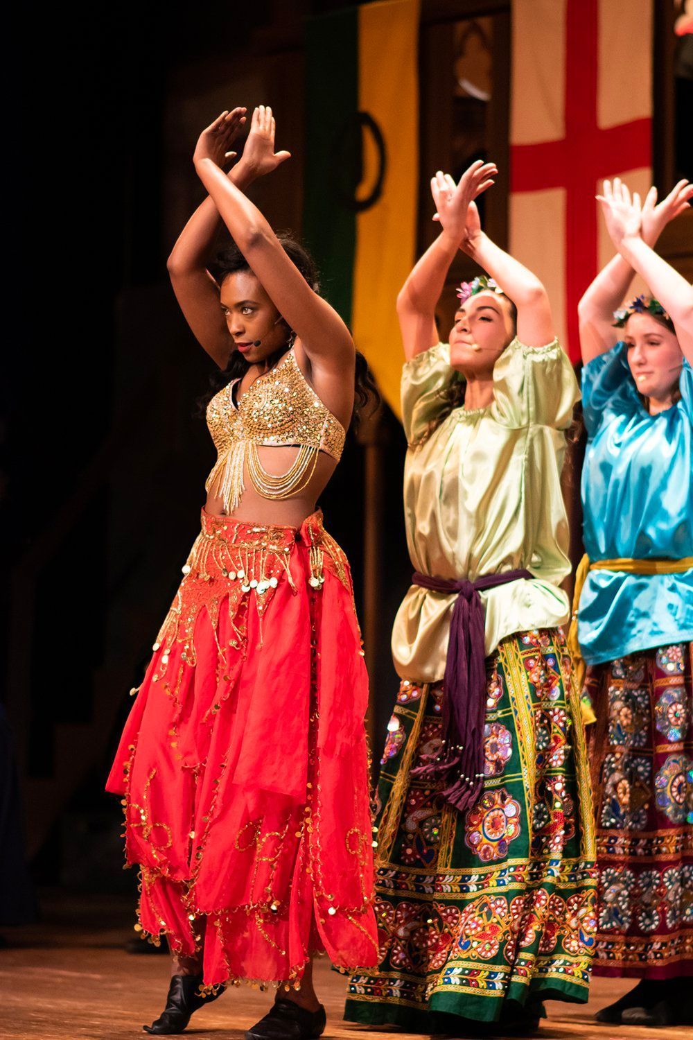 This show presents a unique opportunity for movement through traditional musical theatre choreography, world dance, and storytelling expressed through motion. To dive deeper into Victor Hugo's story, we explored the era in greater detail, including the common customs (Roma, citizens of Paris, leaders of the church, and soldiers) as well as traditional dances that were popular during that period. Drawing on elements of traditional Romani dance (fluid hand movements, hips and shoulder isolations, turns, complex tapping and patting, and the use of silks) and musical theatre elements (stage combat, partnering, ballet), we are drawn into scenes unfolding in real-time. When in storytelling mode, you will notice the congregants' body language change, and their movement (body placement, crossovers, flocking, tableau) synchronize as if one entity to set the stage for the story being told. Although mostly stationary, even the choir stands and sits at specific times with intent.