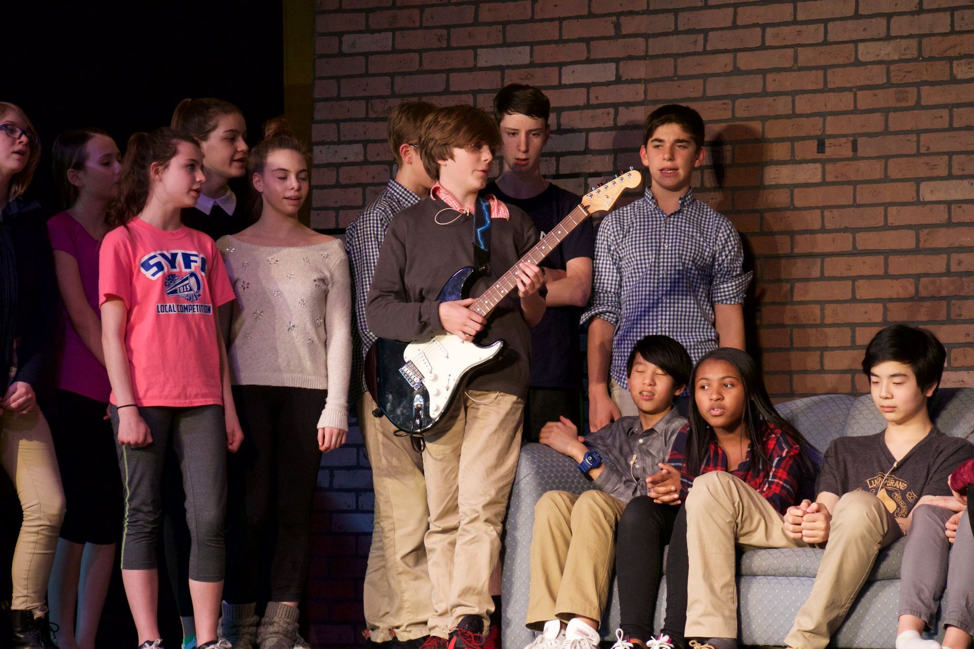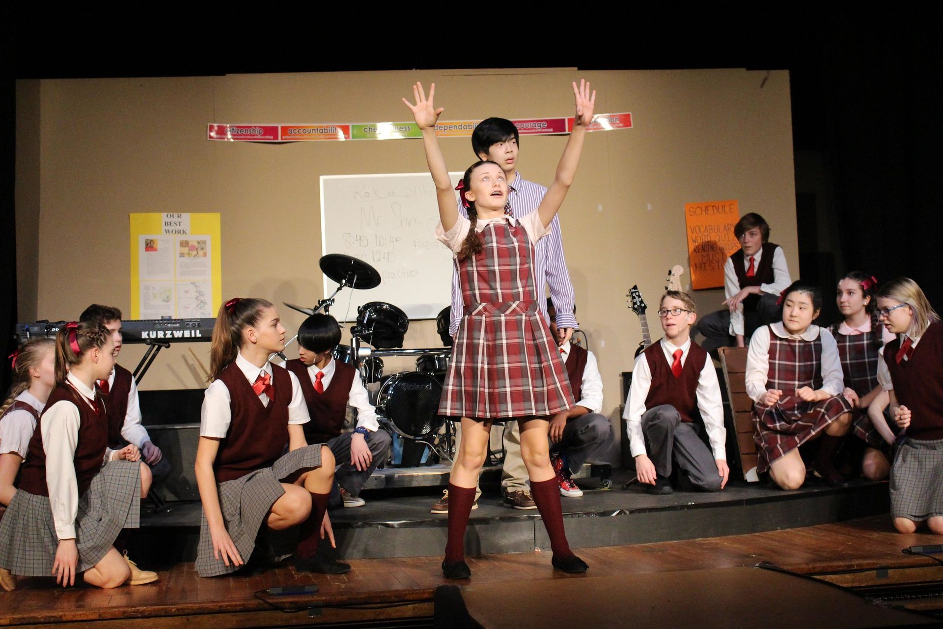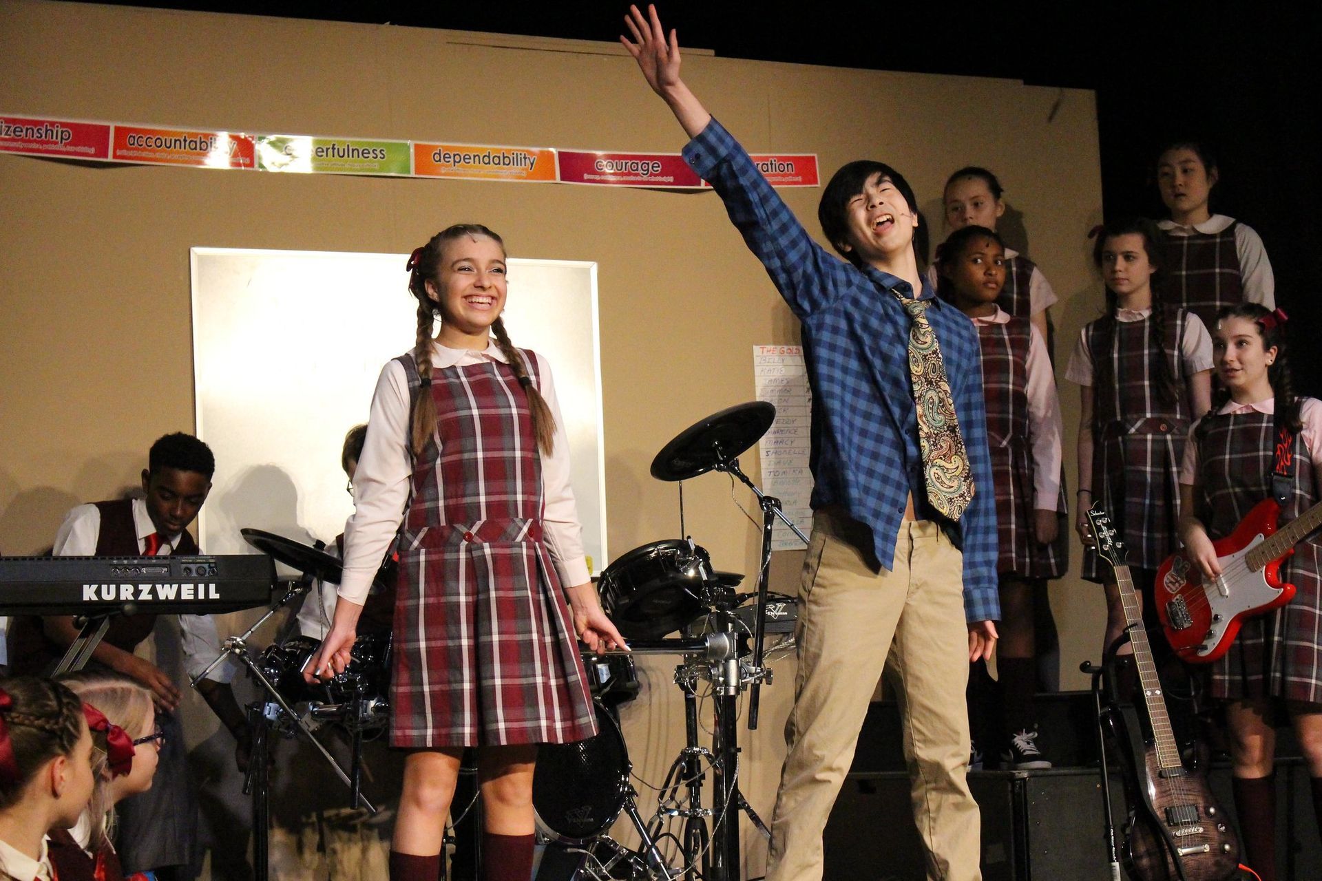 Rock-concert energy meets kid-powered storytelling. The movement combined freestyle rock 'n' roll, musical theatre basics, and character-driven staging. Choreography focused on attitude, physicality, and joyful chaos. Adult (Teacher) ensemble work mirrored the stiffness of the school environment to create contrast with the kids’ explosive energy.